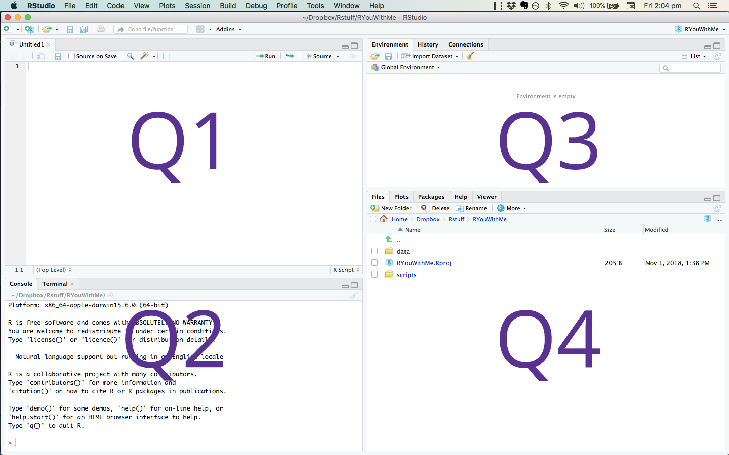 - Understand what happens in the “four quadrants” of RStudio