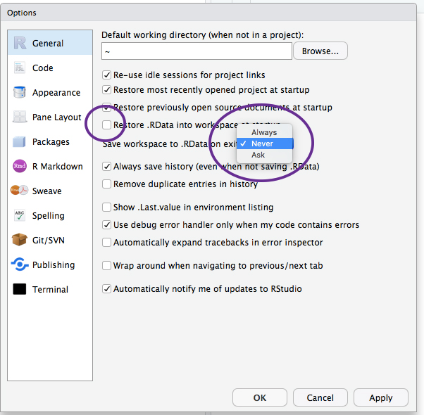 Some people like Rstudio to remember stuff from session to session. We think this is dangerous. So to avoid future hassle, we recommend that you change two settings.