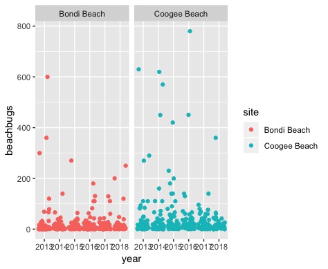 facet_wrapto visualise beachbug levels across years, separately for each site.