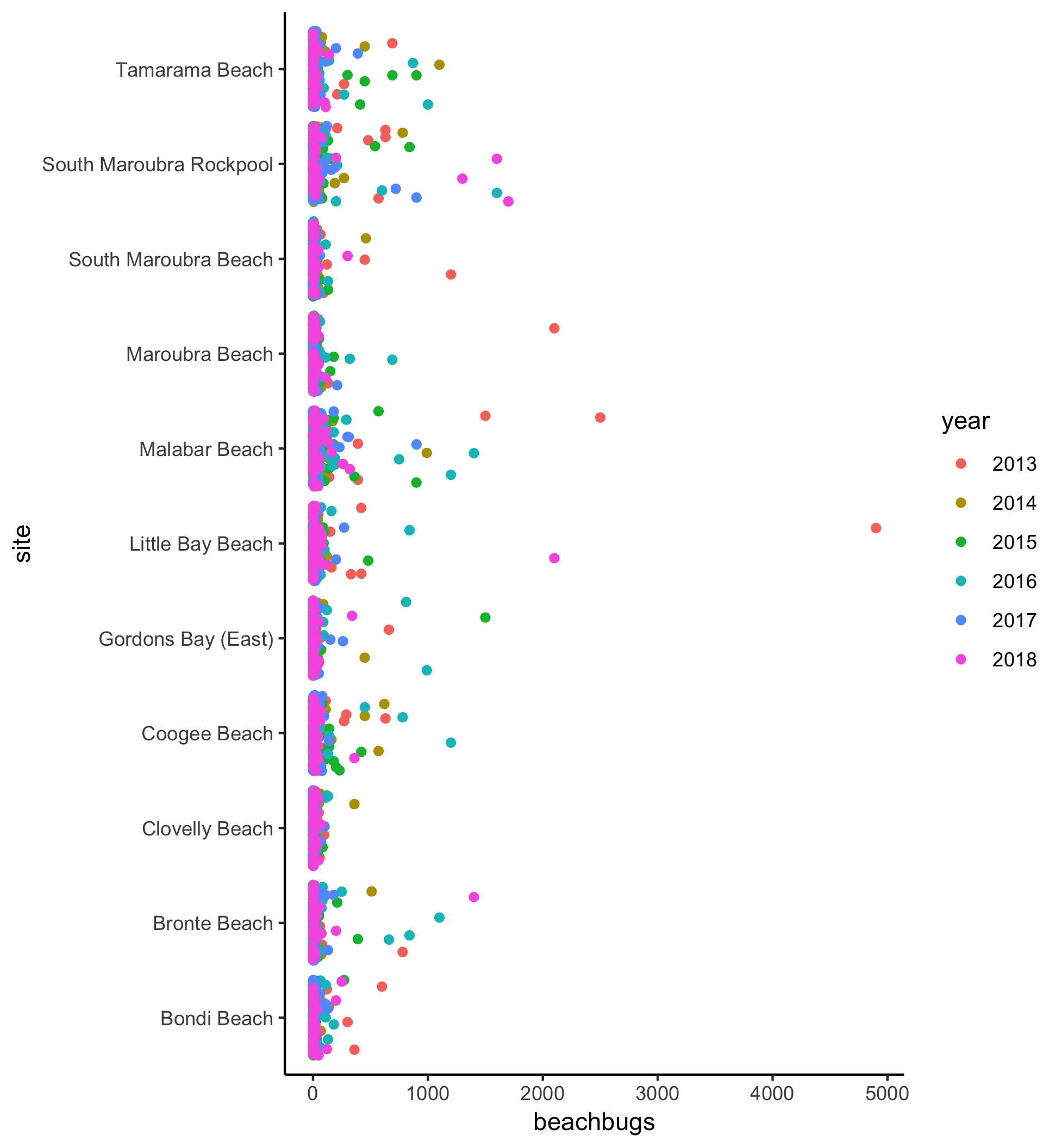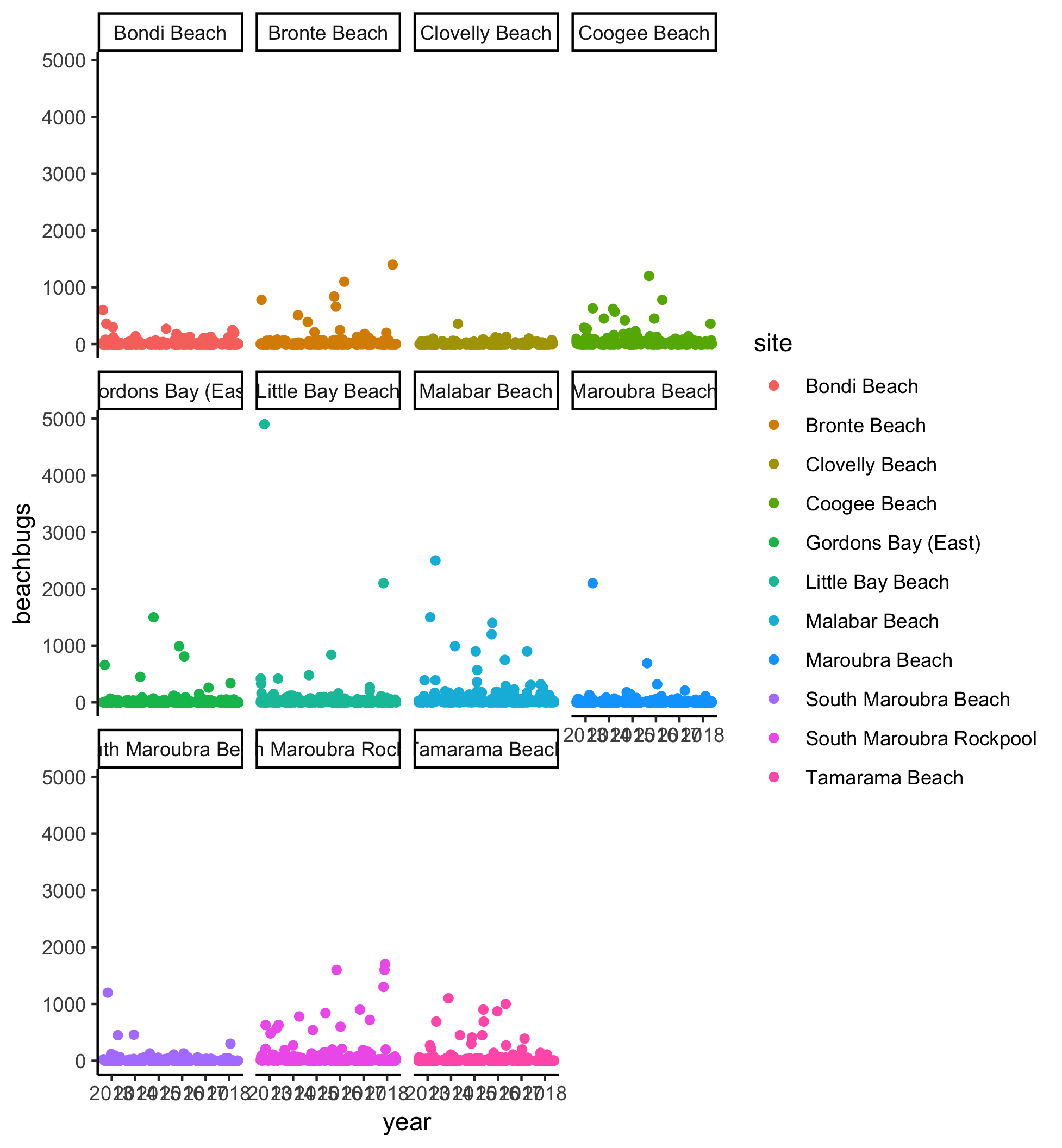 There doesn’t seem to be an obvious improvement in bug levels in the past 5 years. I wonder whether some beaches are just more variable than others. Let’s use colour to differentiate between different sites.