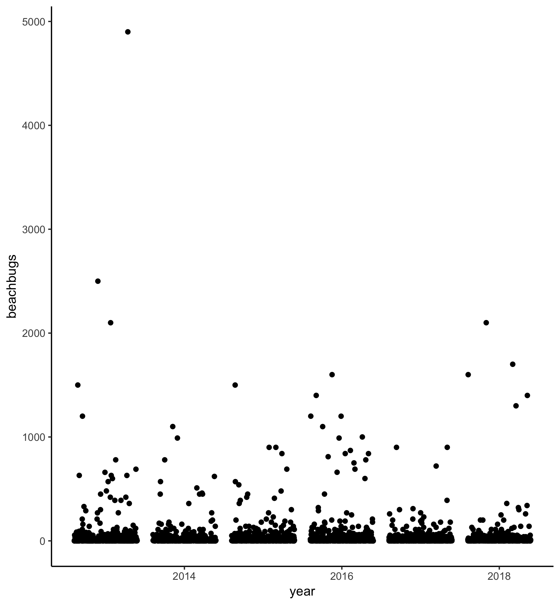 geom_jitterto plot bug levels for each site, differentiating between values from 2013-2018 with different coloured points - Try colouring the points by another variable (perhaps council or month). How does the visualisation change?
